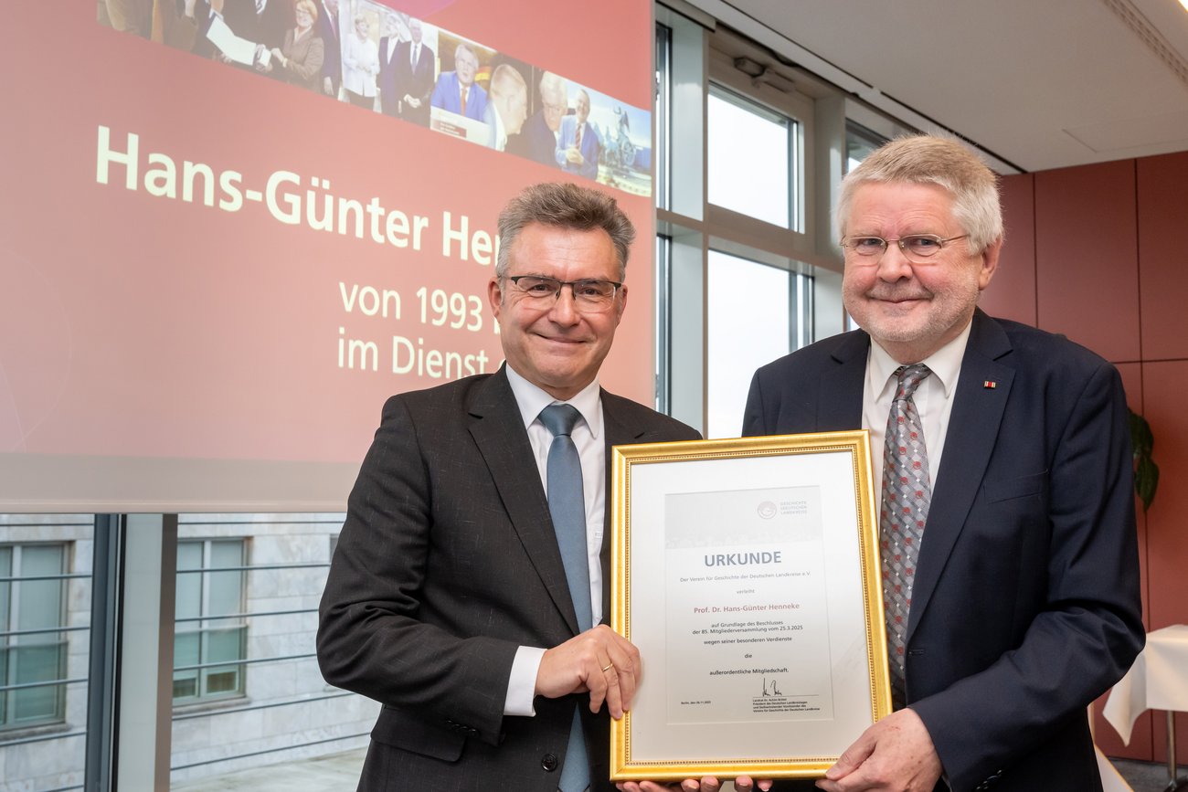 DLT-Präsident Brötel (links im Bild) überreicht dem verabschiedeten Hauptgeschäftsführer eine Urkunde zur Verleihung der außerordentlichen Mitgliedschaft im Verein der Geschichte der Deutschen Landkreise (Abdruck honorarfrei, Copyright: DLT/Peter Himsel)